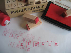 I dag faldt jeg f.eks. over en æske bogstavstempler. Helt enkle. Og en rød stempelpude. Og lagt sammen med noget, jeg allerede var i gang med derhjemme og et par flyvske tanker over en kop kaffe på Drudenfuss, så ser det ud til at kunne blive en bog. Formentlig. Det tegner i hvert fald til det. Sådan en helt let og luftig en.