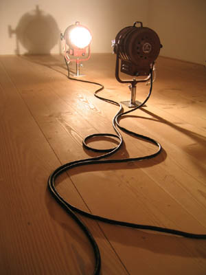 Er to lysende projektører placeret på gulvet i et afgrænset rum KUNST? Ja, jeg synes det. Jeg er faktisk helt vild med det værk. Der er så meget humor i det. Så opløftende. For de står der og lyser så intenst, de to projektører – som to mennesker, der er gået i kontakt med hinanden. Måske to egoer, der forsøger at overstråle hinanden? Måske kan der ligefrem være politiske undertoner i det? Det er da lige før jeg kan se to præsidenter – måske Bresjnev og Nixon for mig. Eller endnu bedre: to mennesker, der i den grad er brændt varm på hinanden? I hvert fald udsender de et lys og udvikler en varme, som lægger sig om en, når man er i rummet. Jeg har gået og hygget mig med værket i lang tid, moret mig over det … og så for et par dage siden (lidt pinligt måske at der gik så lang tid!) opdagede jeg, at det hedder “American kiss”. Kunstneren hedder Ange Leccia og værket er fra 1986.