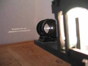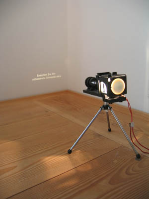 Endnu et værk fra udstillingen Call it what you like på KunstCentret Silkeborg Bad. Endnu et af dem, som jeg er faldet for. I et beskedent hjørne, måske nemt at overse, står et lille lysbilledkamera og lyser et budskab op på væggen. Igen … efter min mening … humoristisk og med stort vid. “Erreichen Sie das volkommene Unverständnis” (Opnå den fuldkomne fornemmelse af ikke at forstå – sådan cirka). En kendsgerning vil jeg nærmest kalde det. I hvert fald i den grad genkendeligt fra mig selv. At det at forstå … ikke er så ligetil. Og målet er måske slet ikke … at forstå. Måske er tilstanden “uforståelighedsramt” langt mere interessant. Og vel tit et resultat, når man dykker ned, dykker ind … og forsøger at forstå og forstå og forstå.