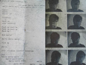Arbejder under titlen: Pack up your troubles. Griner en del undervejs. Pack up your troubles …. and smile, smile, smile. Fotograferer, klipper, klistrer, stopper i computeren, bearbejder, printer ud. Lag på lag. Griner mere. Som da vi for eksempel opdagede, at vi pludselig var på skærmen.