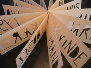 Fra udstillingen i Hinnerup “Fra pixi til XL” har jeg genbrugt bogen “Skåret ud i pap”, som på engelsk har fået titlen “Spelling it out (circle of life)”. Og så har jeg lavet en mere bogagtig version af “Store ord”, som også blev vist på udstillingen i Hinnerup. Den har så fået den engelske titel “Grand words”.