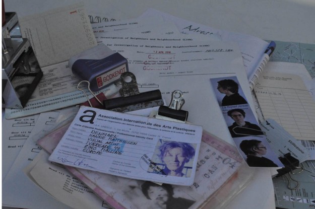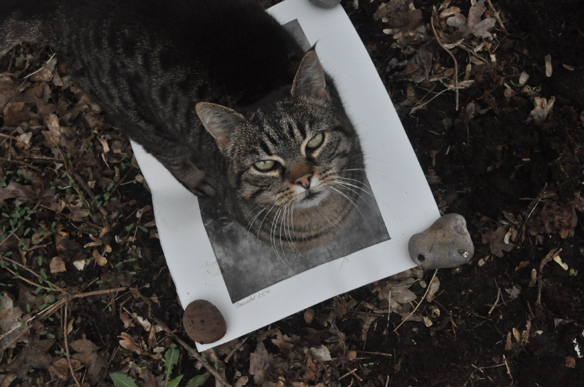 Og så har jeg gået og tænkt. Hvad sker der mon, hvis jeg lægger tryk i haven? Der er jo forskel på fotopapir med print og blank overflade og så et tryk med tryksværte på stoftligt papir. Så det er det næste projekt i Decompose/Recompose projektet. Og det er startet i dag med udlægningen af det første tryk. Og nu kan jeg så bare gå spændt og vente på … hvad der sker??? Hvilke spor sætter naturens kræfter? Tja … de første spor, der blev sat, var nu af en af husets fire katte, som bare nysgerrigt måtte være med og i øvrigt bare helst ville snakkes med!