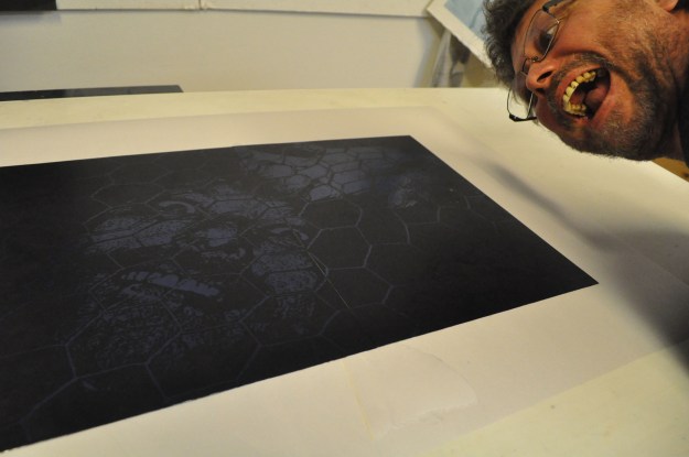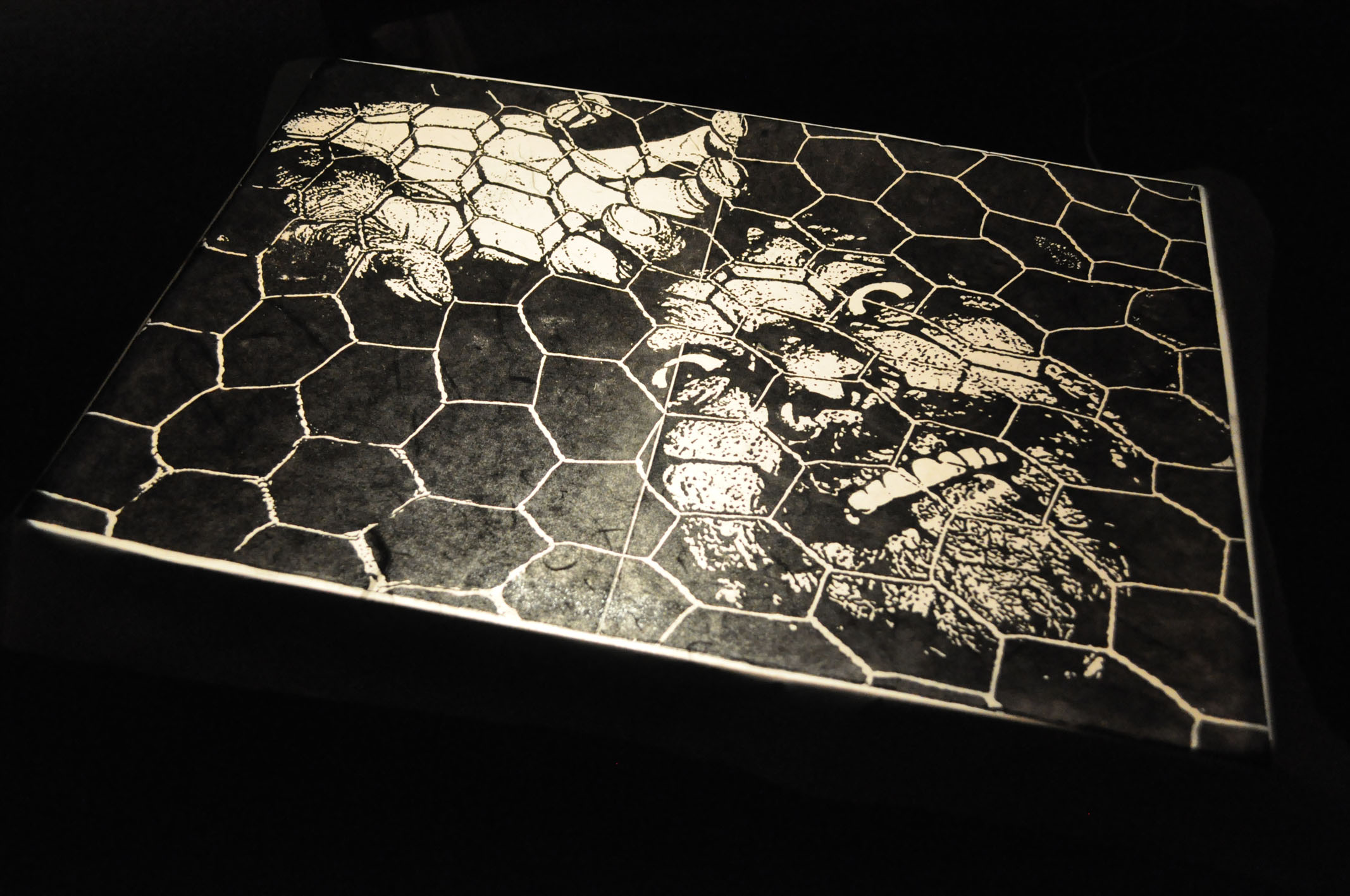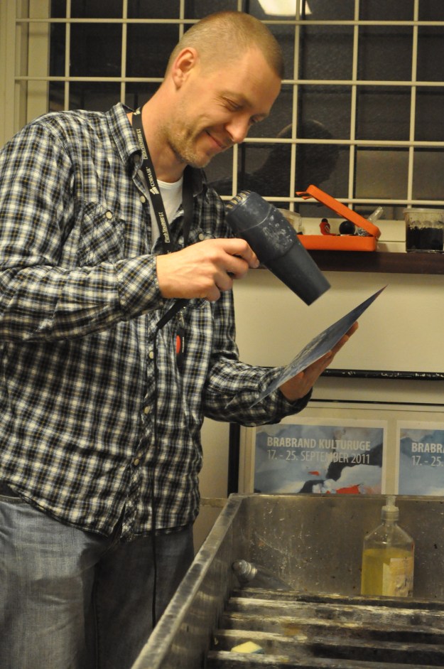 Fysisk: lyskasser i et mørkt rum. Og igen et fælles værk – billedet består af to plader, to tryk – et til hvert.