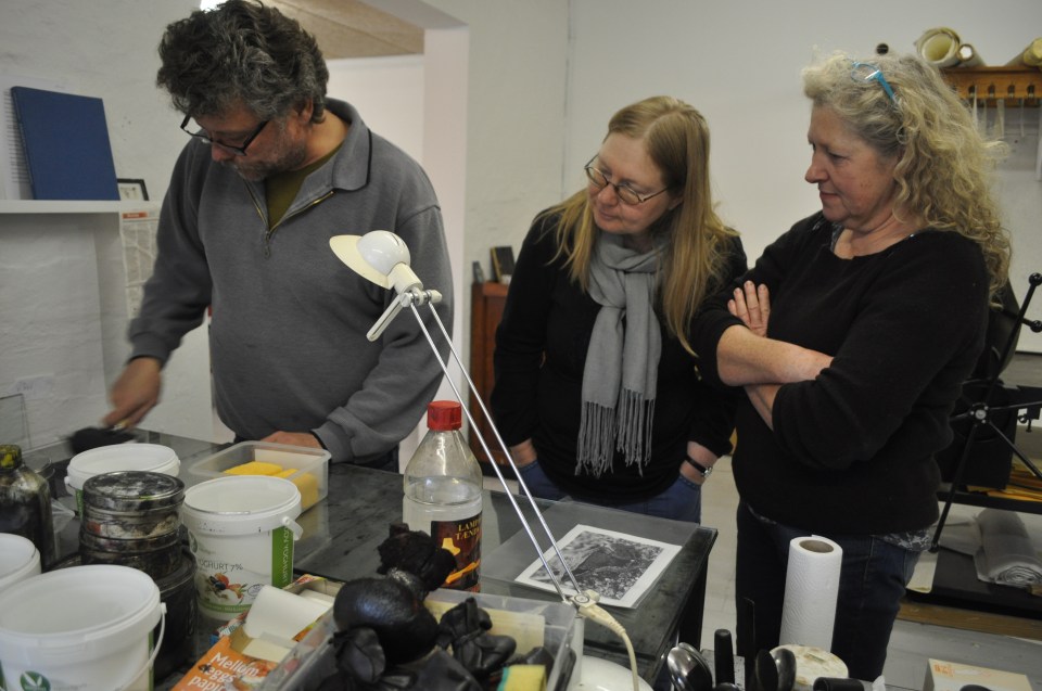 Polyester plade lito – introkursus 16.11.13 012 Næste → Først var jeg på med fortælling om og intro til teknikken … og nu er vi nået frem til Joes afdeling … Lis og Taina følger opmærksomt Joes beretning om kunsten at valse et gråtonerigt foto ind …