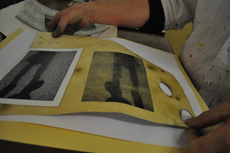 Polyester plade lito – introkursus 16.11.13 051 ← Forrige Næste → Lis Wuisman trykker på eget pergament – lavet af dyrehud. Vildt spændende!