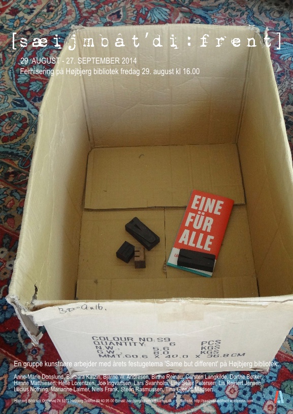 Så er det lige før vi går i luften med dette års festugeudstilling på Højbjerg Bibliotek. Temaet for festugen er i år: SAME BUT DIFFERENT, og det bliver så i vores verden til [sæijmbåt’di:frent] . Konceptet er stramt i år. I hvert fald set udefra, idet alle kunstnere må bidrage med et rum svarende til en standard flyttekasse. Derudover kan man gøre som man vil 🙂