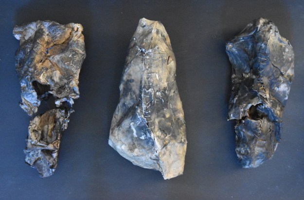Overfladerne i de mørke pupper er inspireret af Tollundmandens mørke farver, men også af Silkeborg Museums lerkar – deres overflader og skårsamlinger. Stumper og stykker samlet til en tilnærmelsesvis helhed i forsøg på at få et indblik i fortiden. Sådan samler sytråden pupperne.