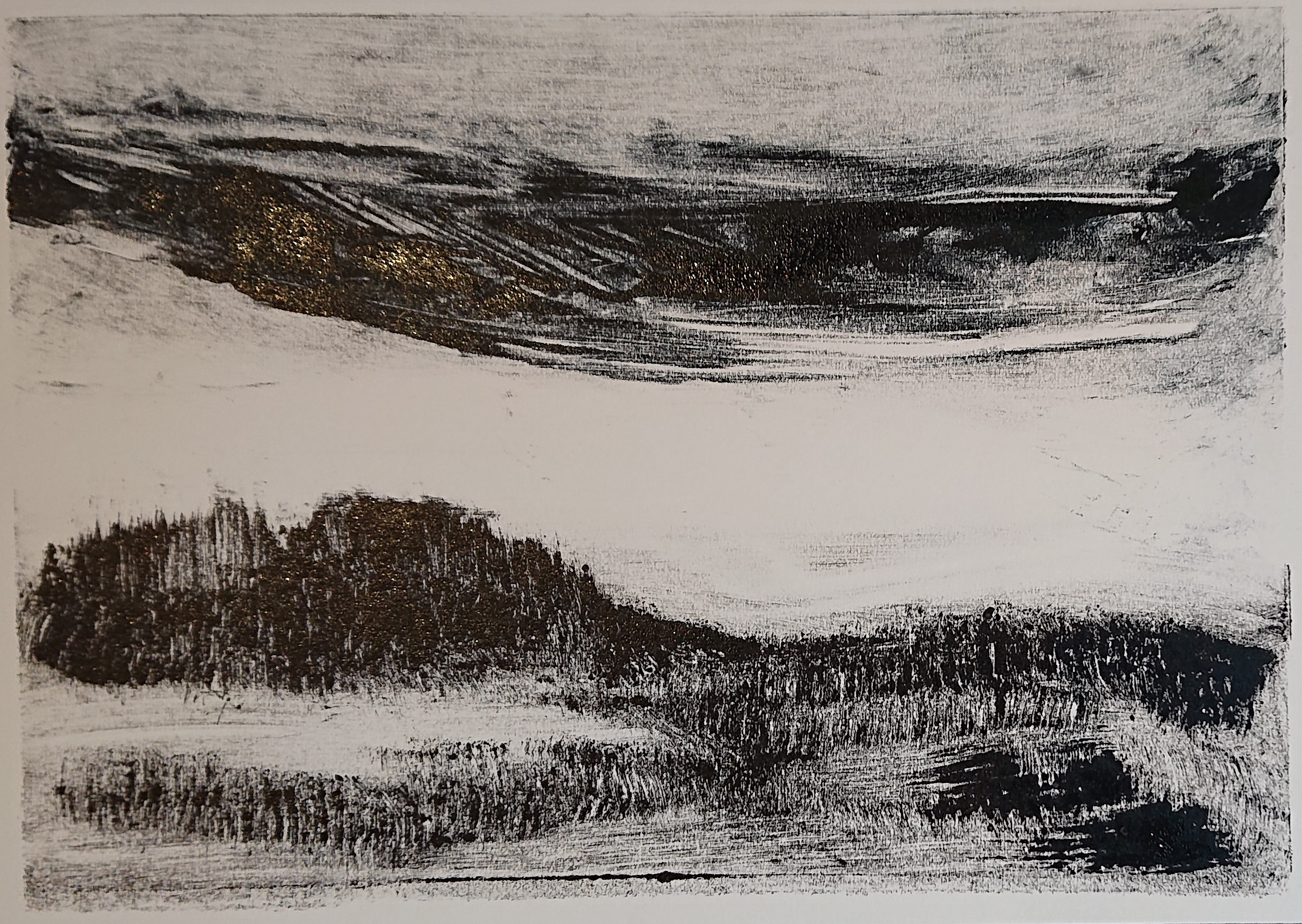 Jeg har det seneste års tid forsøgt at bevæge mig væk fra den fotobaserede grafik. Jeg slipper den ikke helt – for den er et fast holdepunkt. Men jeg har også behov for at arbejde mere frit. Så det er pensel og transparent og tryksværte. Monotypisk. Og forsøg på at mane landskaber frem. Det går i ged (lidt for meget lige nu, synes jeg – damn it!) eller det bliver sådan okay. Jeg længes efter wauuuu-oplevelserne. Men min fingerspidsfornemmelse er rusten oven på et længere periode, hvor meget andet har fyldt min tilværelse. Så jublen lader lidt vente på sig. Jeg er nødt til bare at blive ved – og håbe på at det lukker sig op. 1000 tegninger skal der til, sagde en tegneunderviser engang for mange år siden …. så er der nok en imellem, der er rigtig god. Gid pokker havde de 999.