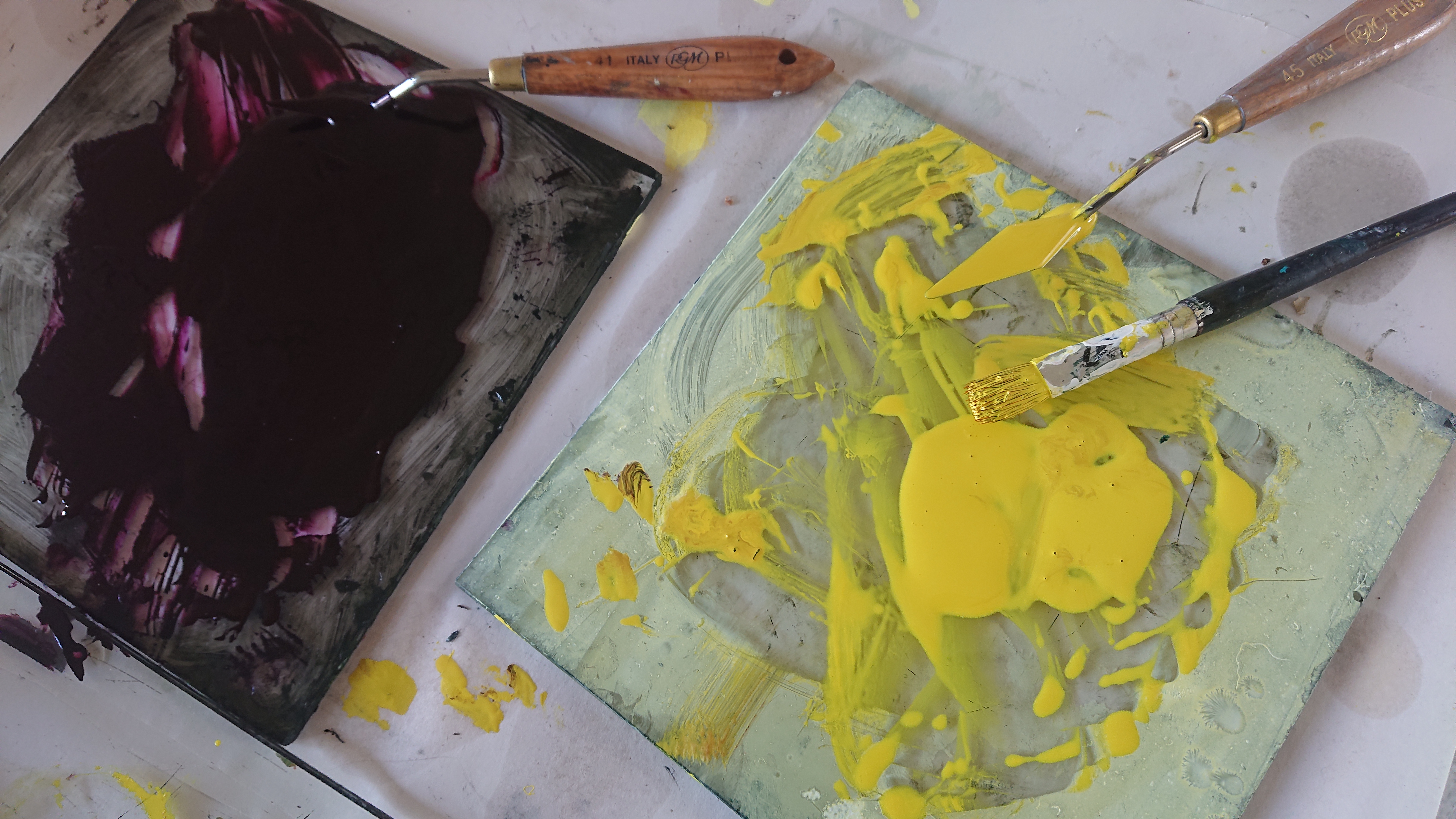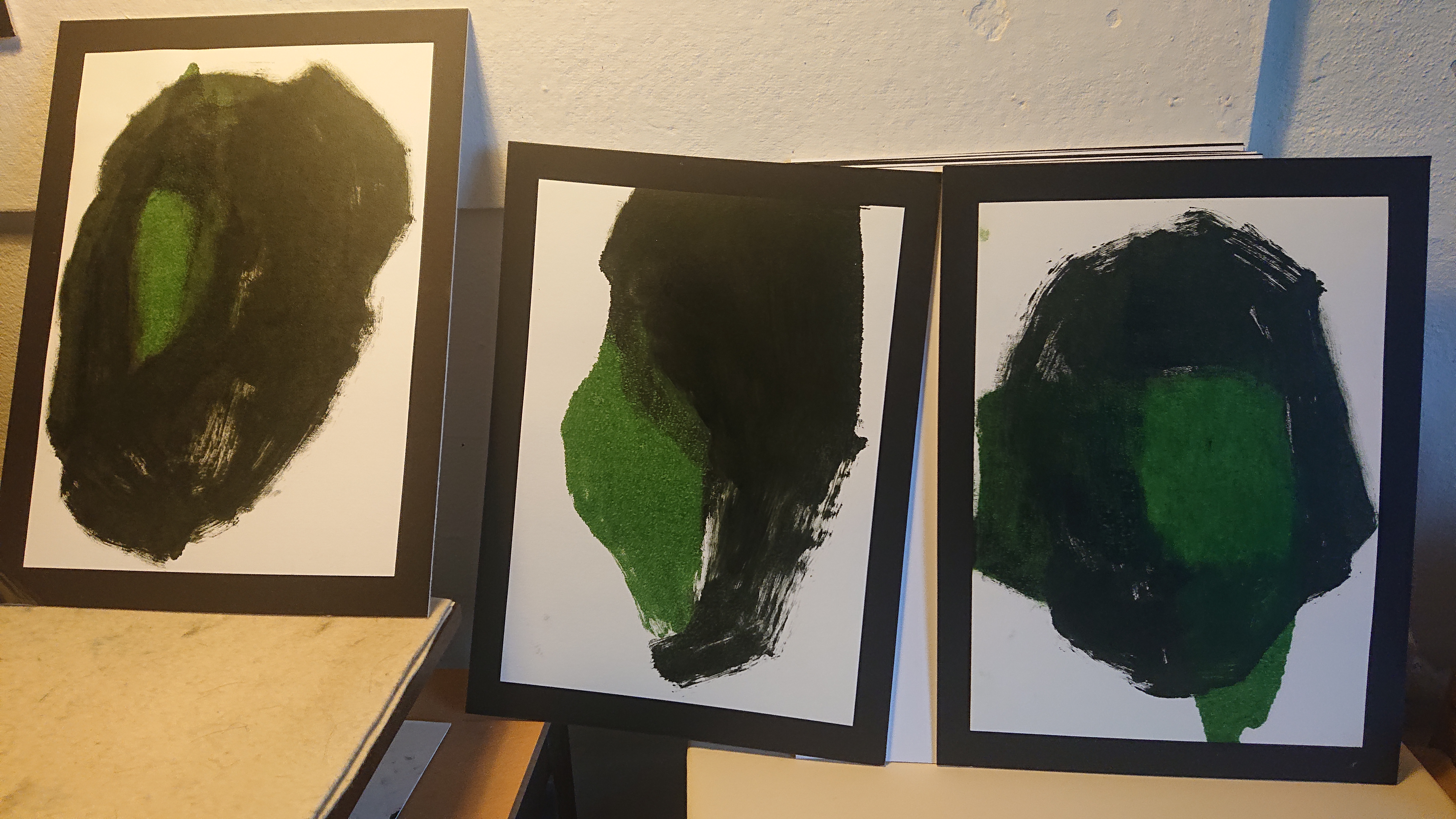 Er i gang på værkstedet med nye eksperimenter. En kombination af fotobaseret tryk (algrafi = plantryk, off set plade) og monotypi. Som nævnt tidligere så forsøger jeg at komme væk fra tryk, som udelukkende er fotobaseret. Det fotobaserede duer bestemt til noget. Jeg har bare brug for det umiddelbare lag, “tilfældighedernes” spil. Det håndgjorte. Det mere maleriske – kunne man måske sige. Lægge lag på lag og se hvad der sker.