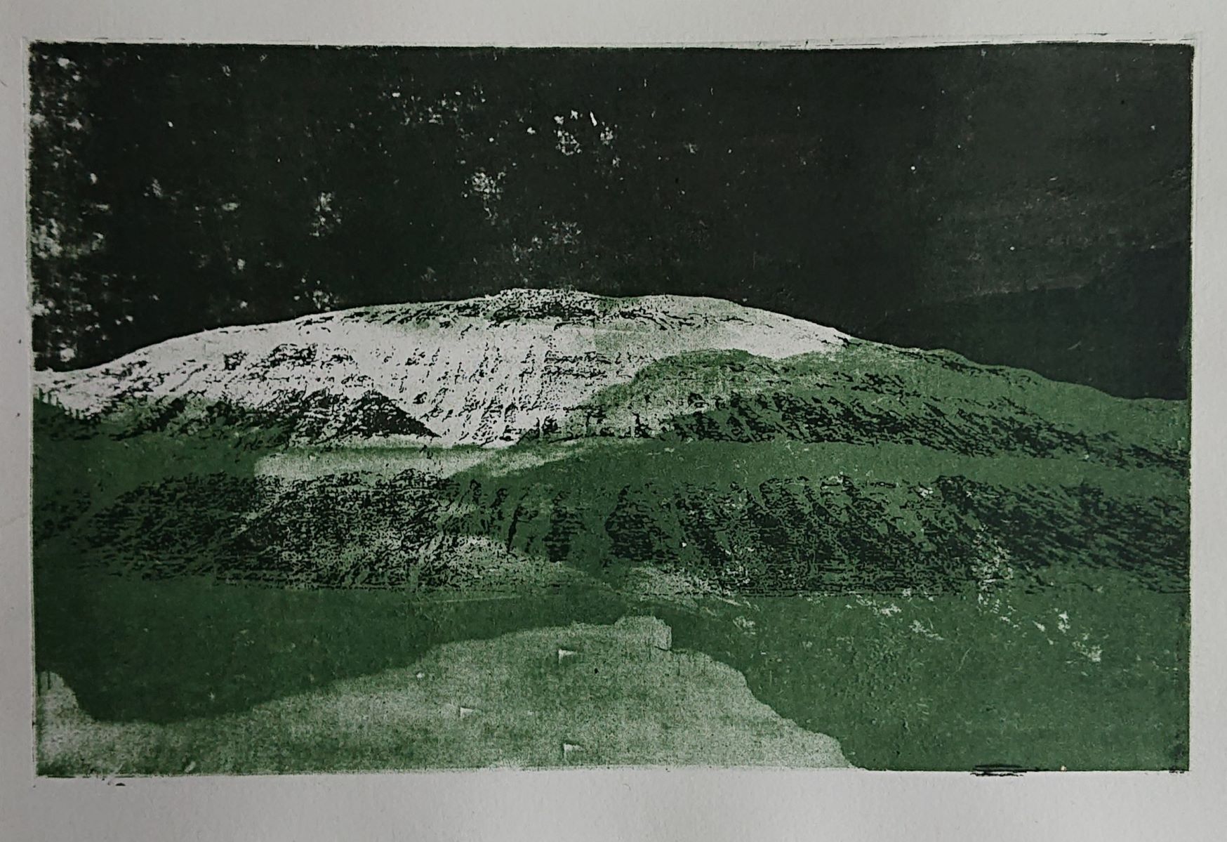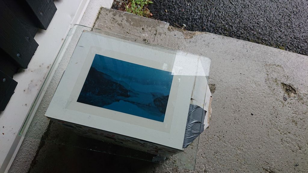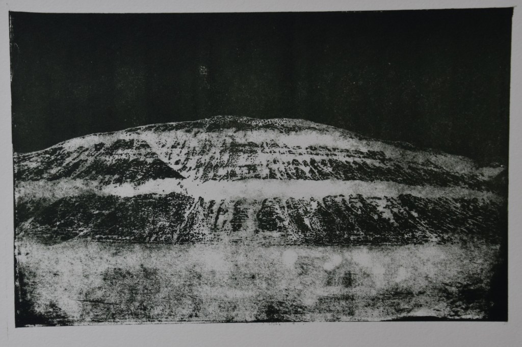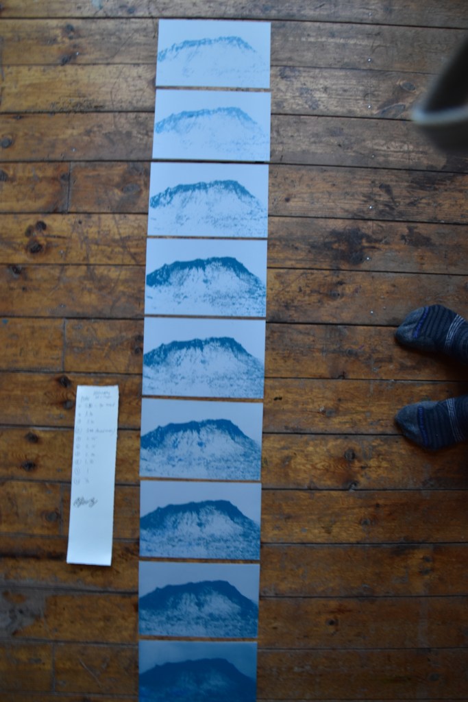 Og netop det gør det også udfordrende at belyse offsetplader au naturel. Jeg kunne ikke – på trods af flere tålmodige lysprøver – ramme den rigtige belysningstid. Hjemme i belysningsskabet er det 2 minutter. Hver gang. 15 sekunder kan være afgørende. Denne dag i Tórshavn er det et sted omkring 5,5-6-7 minutter. Himlen skifter mellem mørkegråt, lysegråt, sol, regn i strømme og støvregn – og alt midt imellem. Og lige så sjovt det er at forlade sig på det lys, der er i tilværelsen…. lige så øjebliksfrustrerende er det, når nuancerne ikke er til at hive frem. Der er et væld af dem, når jeg belyser hjemme. Her er jeg nødt til at overgive mig – til sidst, efter trængsler – til at arbejde med mere enkle motiver, hvor der er mere kontrast end nuancer. Jeg er ikke meget for det, men jeg er nødt til at bide i det sure belysningsæble. Så når jeg lige her og nu arbejder med belysning og offset plader, så bliver det enkle kontrastmotiver. Og så må jeg i stedet eksperimentere med lag med mere. Arbejde med variationer af samme motiv.