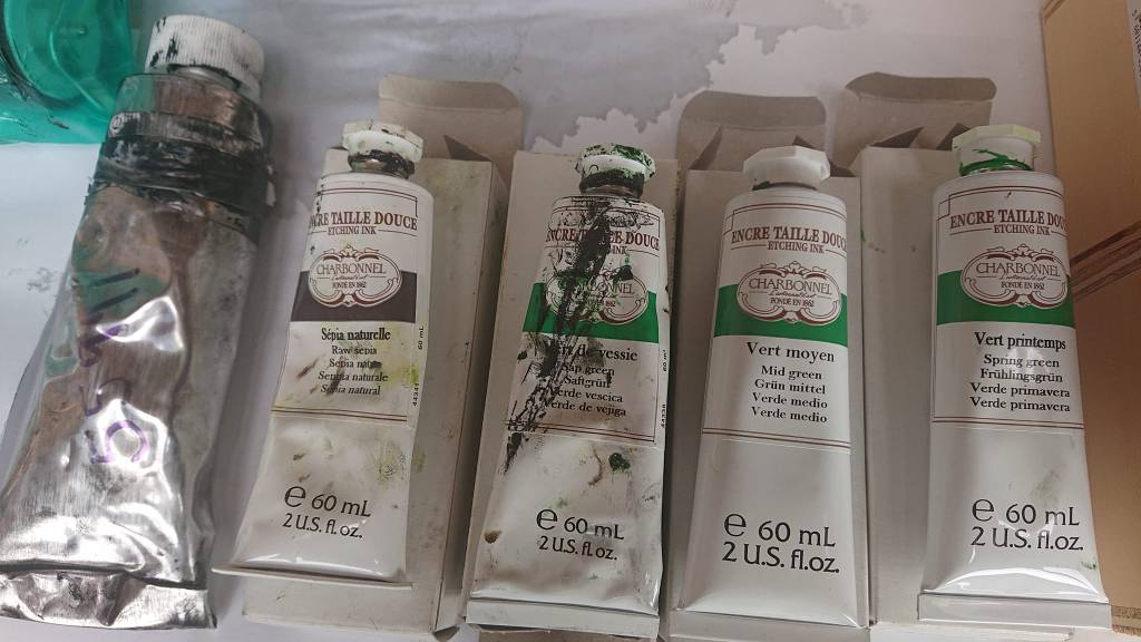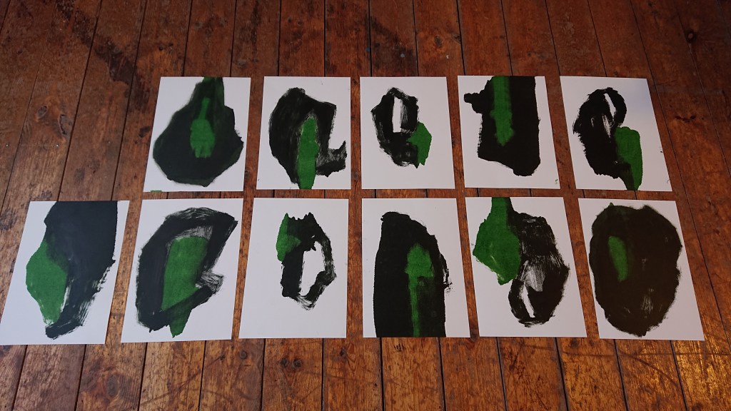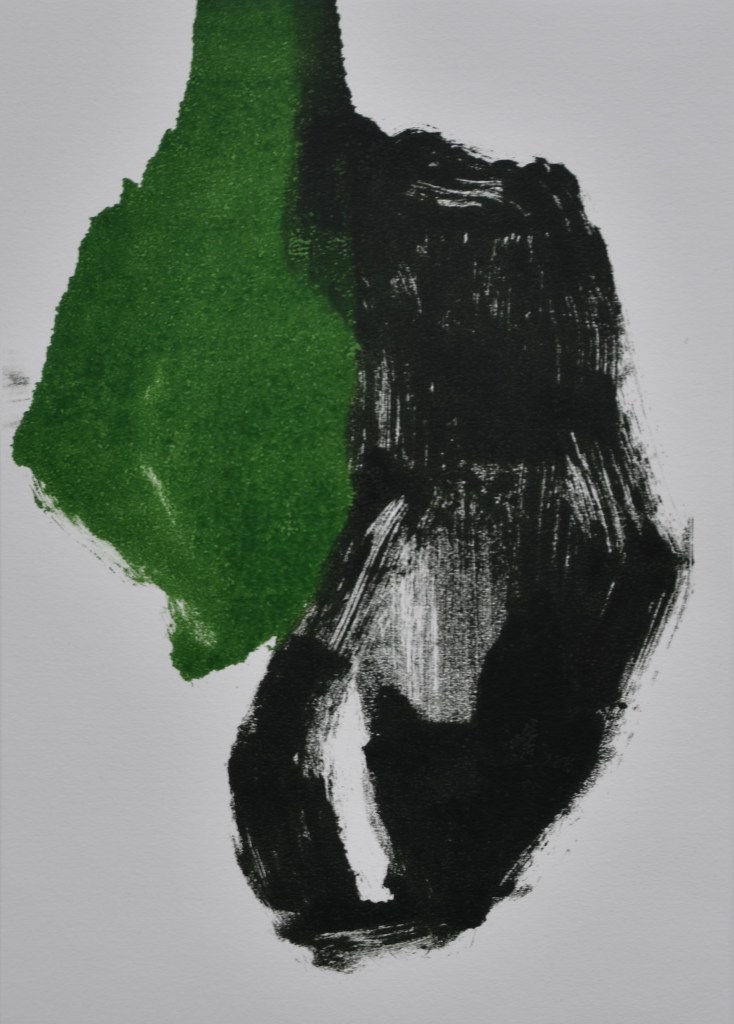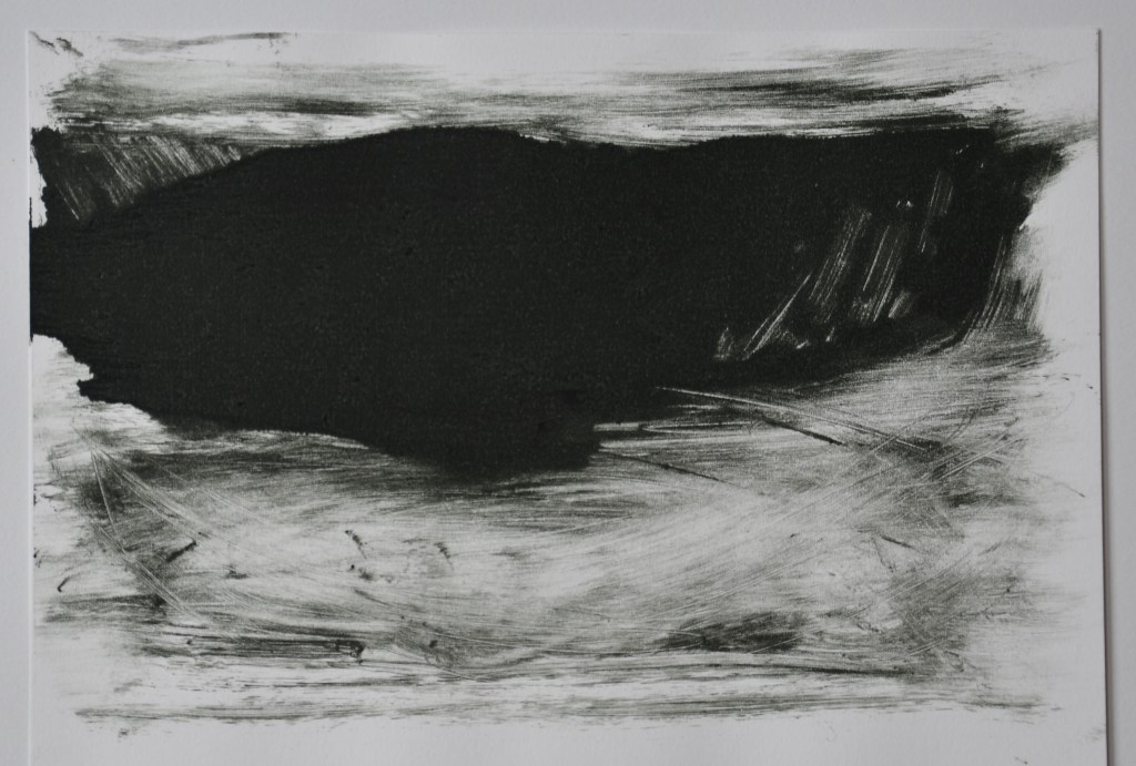 Jeg går med nogle drømme om nogle billeder. Enkle former. Vilter pensel på “plade”. Monotypier. Engang dukker de forhåbentlig op på papiret.