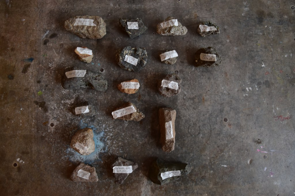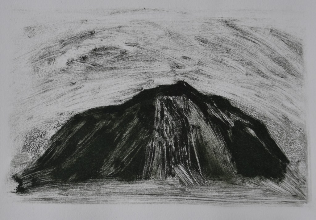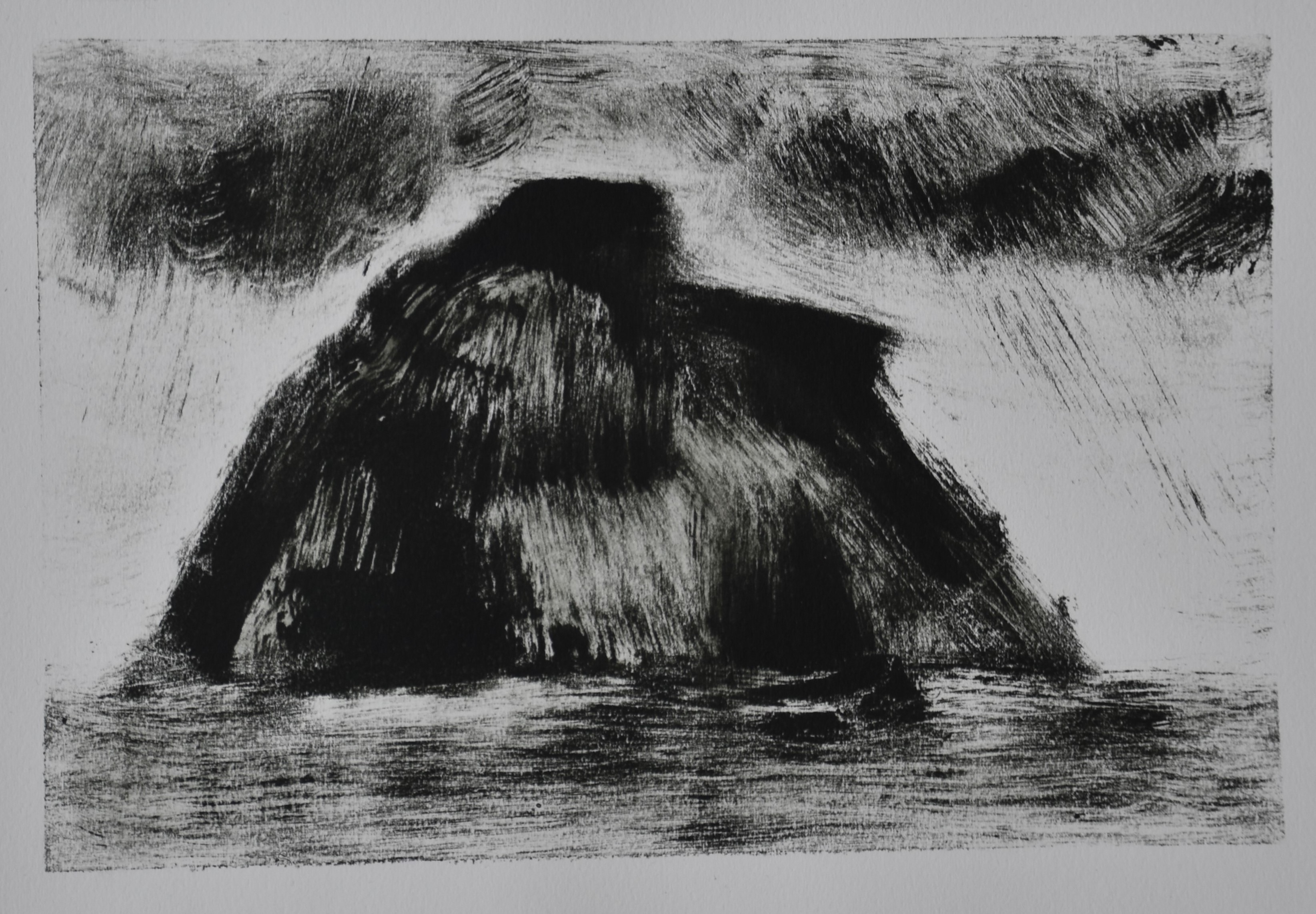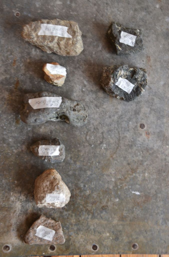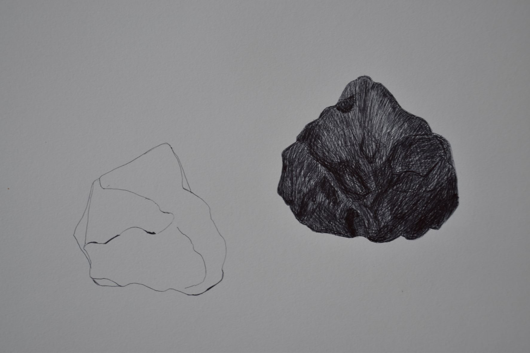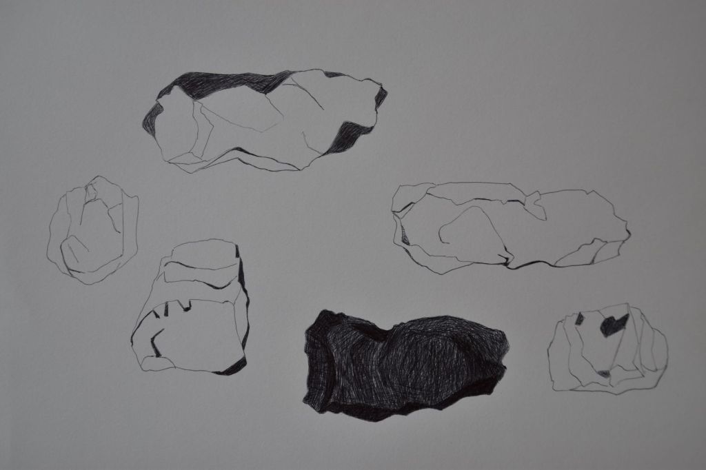 Værkstedsarbejdet skal lirkes i gang. Først praktisk. Etablere værksted. Så noget håndgribeligt og nærliggende. Sten. En sten eller to fra steder der besøges. Den første dag: Hvitanes og Kirkjubøur. En kuglepen, et stykke papir og en sten. Helt nede på jorden. Tegninger frit efter de fundne sten. Bare for at få fodfæste i en hel måneds frihed midt i uroen. Så der måske langsomt falder en sten fra mit hjerte.