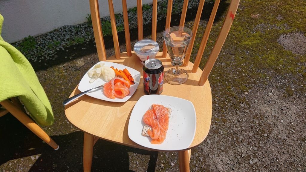 Vi har aftalt, at i dag (opholdets dag 4) er en værksteds/arbejdsdag. YR meldte regn. Og der var også regn – og blæst. En del af dagen. Men fra sen frokosttid (ca 14.30 opdagede jeg, at jeg var hundesulten) var der sol og lune, og vi kunne sidde ude og spise frokost. Vejret skifter hele tiden. Aftenen var tør.