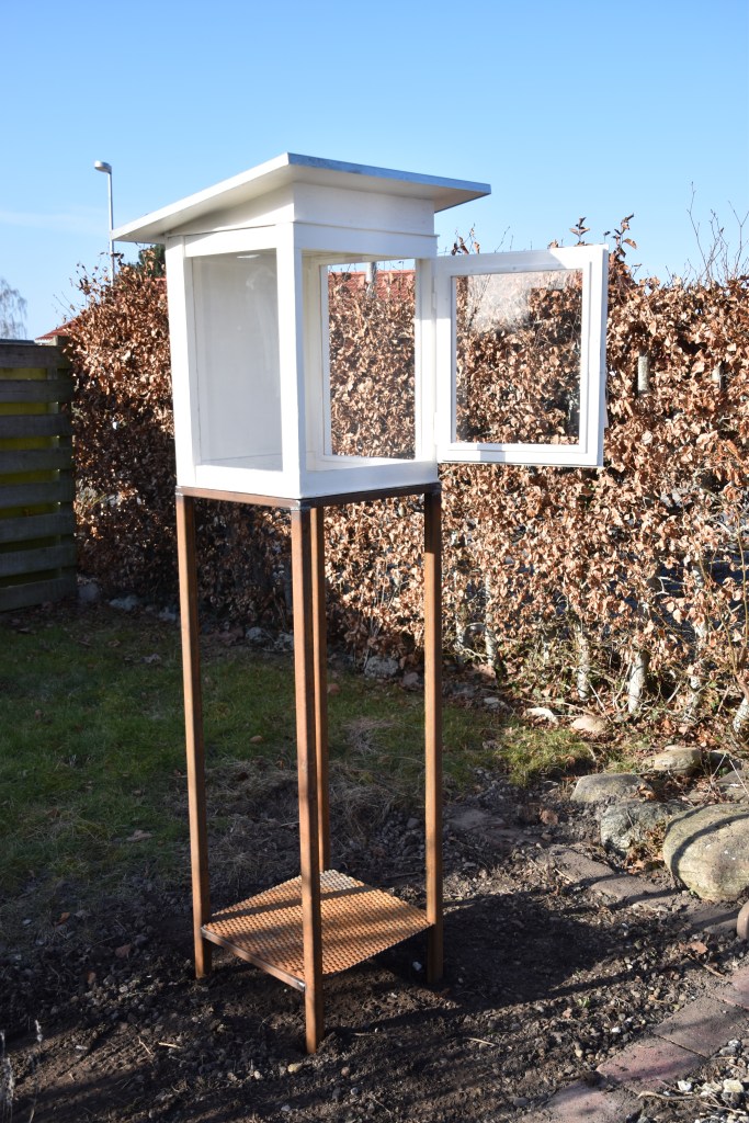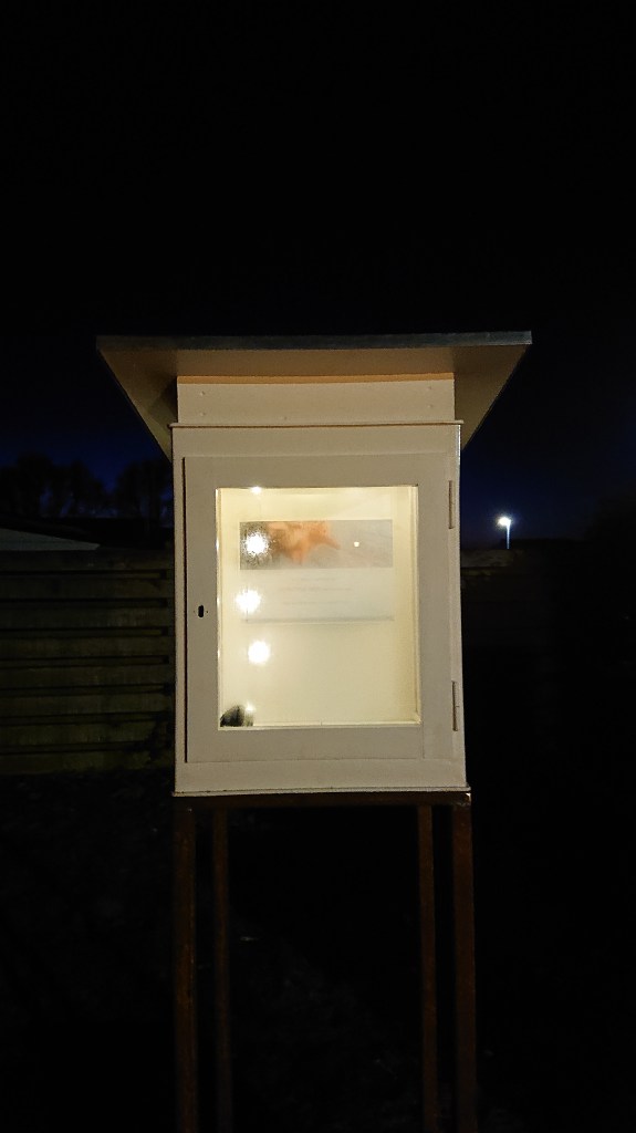 Med hjælp fra JP Rammer og ikke mindst Edvard og hans kolleger fra upcycling.inc er det lykkedes at ombygge et gammelt, smukt flueskab til et lille kunstskab, en “kunsthal”. Den er nu placeret på min egen matrikel og med let adgang for interesserede forbipasserende. Og alle er velkomne til at kigge forbi.